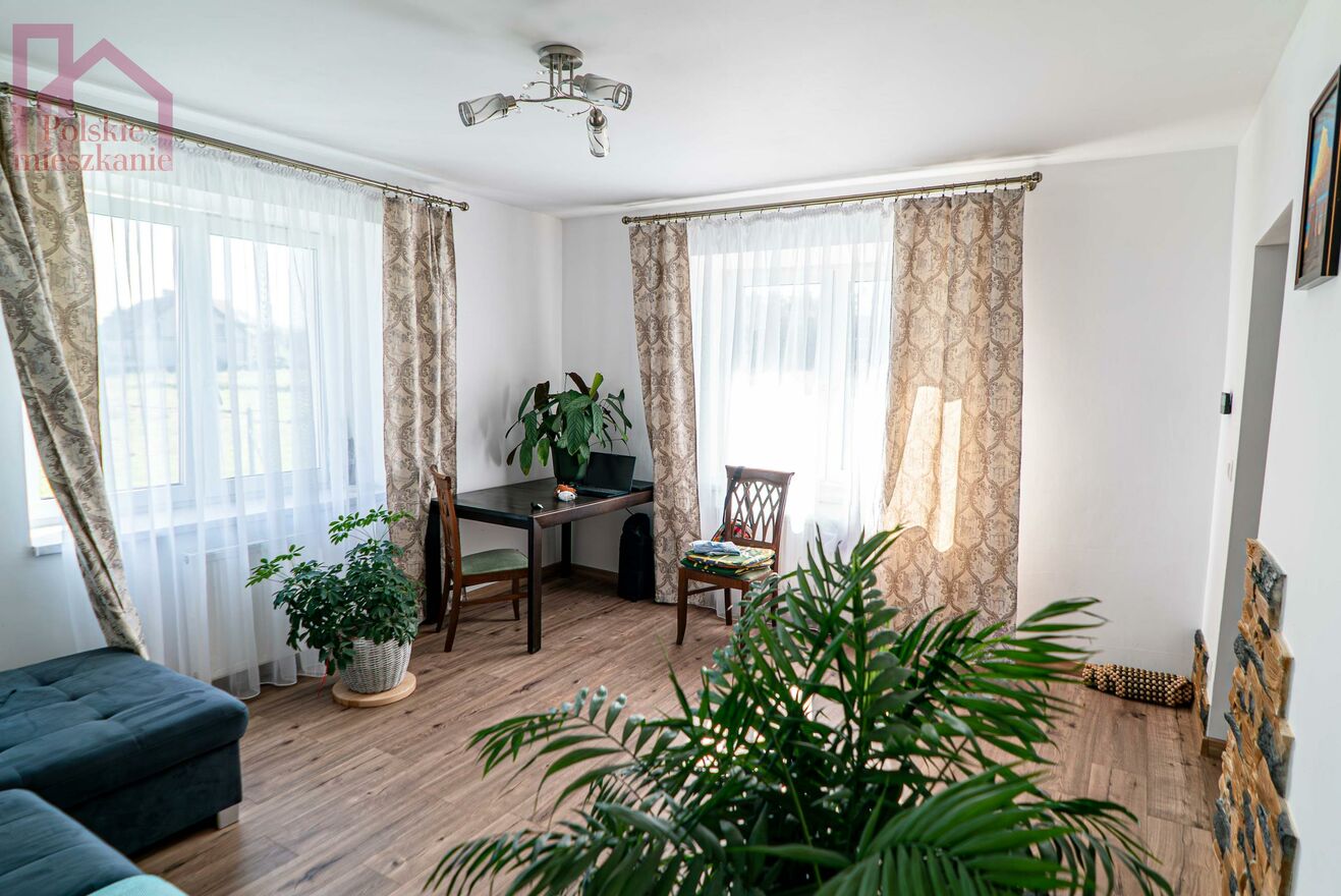 Budynek ładnie prezentuje się, nie potrzebuje wkładu finansowego i jest gotowy do zamieszkania od zaraz. Przyciąga uwagę zadaszona weranda, która stanowi przedłużenie domu i łączy dom z ogrodem.